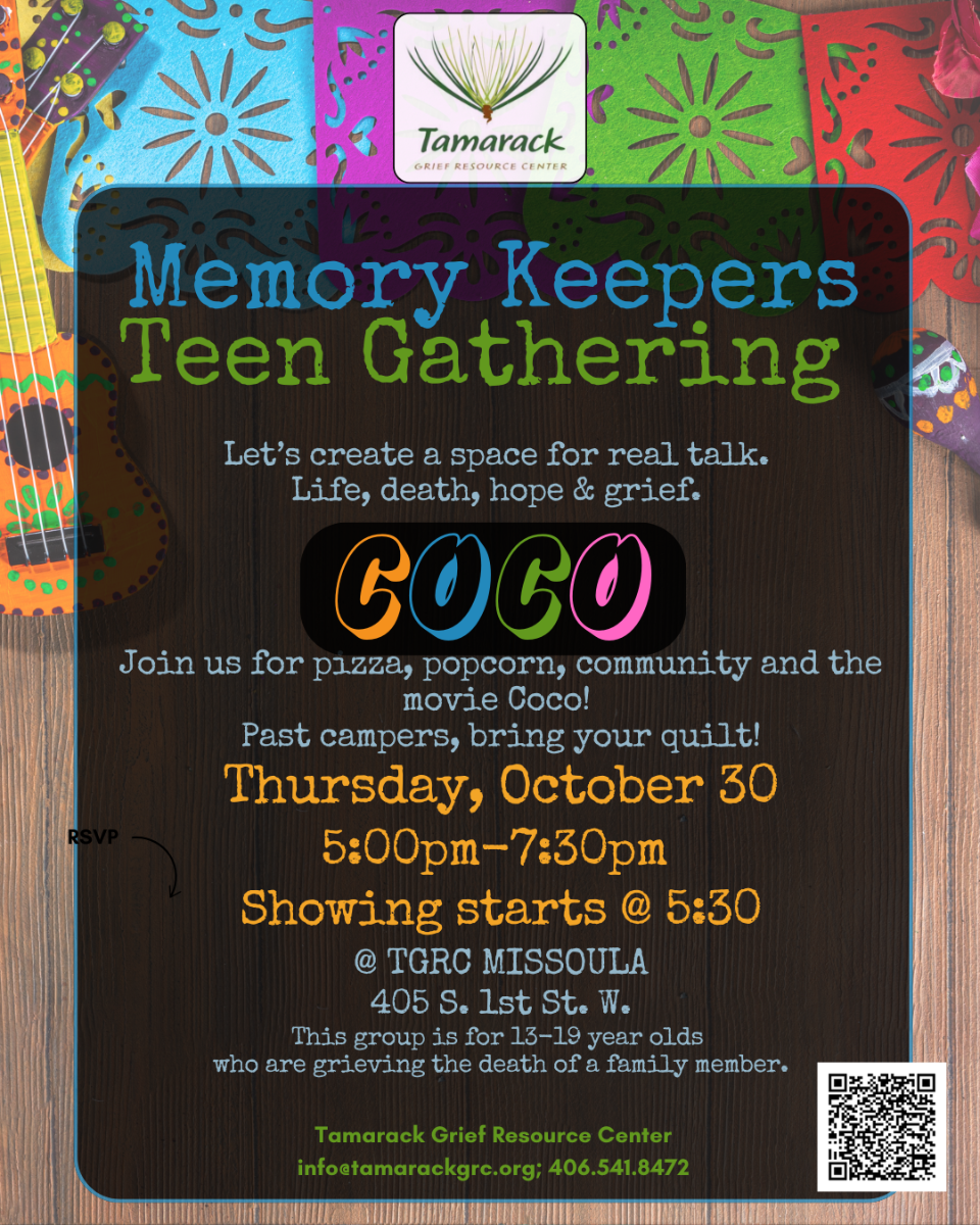 Memory Keepers is a casual grief support gathering for teenagers (13-19 years old) who are grieving the death of a family member or loved one. Let's create a space for real talk. Life, death, hope and grief. Meet us at TGRC Missoula for pizza, popcorn, community and a showing of the movie Coco! Past campers, bring your quilts. Showing starts at 5:30pm. No cost to attend, donations welcome.